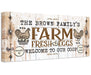 Personalized - Chicken Farm Fresh Eggs - Large Canvas Wall Art (Not Printed on Metal) - Stretched on a Heavy Wood Frame - Chicken Coop Decor - Housewarming Gift to Chicken Farm OwnersBring an elegant touch to any room! This large, vivid colored artwork adds the perfect focal point to any room.UPDATED DESIGNS - We created this design to be on trend with an elegant, timeless style that will greatly complement your homeMADE IN AMERICA - All our canvas artwork is hand-stretched by our employees in Tomball, Texas. We take pride in doing the work here and doing it right.REAL WOOD - We only use real pine 1.5" stretcher bars. We never use cheap particleboard stretcher bars like other sellers.PREMIUM CANVAS - So much of what goes into the final reproduction depends on the quality and consistency of the canvas. We only use acid-free, heavy canvas, which is not only durable but will not degrade over time. The surface has been specially prepared to accept and hold the inks, allowing them to radiate the brilliant color.PREMIUM INKS - The canvas is printed one at a time with the finest UV resistant inks using the latest high-resolution giclee printers. As the ink is laid on the matched and coated canvas, the result is an absolutely opaque, rich and brilliant reproduction. In addition, the UV properties of the ink ensure a fade-resistant, long-lasting beautiful image for decades.HAND STRETCHED - To ensure that the canvas remains taught, it is hand stretched around hardwood stretcher bars, fixed using no less than one staple per inch.THE ART - Now that you know how much effort goes into each piece, itâs time to do the most important stepâ¦selecting your favorite image... Click the Select Options button to start your order