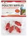 These poultry nipples transform a standard bucket or PVC pipe into a poultry watering device. Nipples are easy to install and help keep water clean and prevent disease. Each nipple accommodates up to 4 birds. Nipples should be mounted vertically. Recommended for adult birds only.
